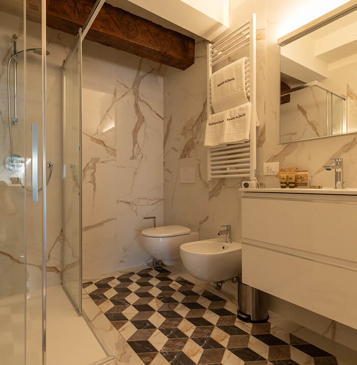 Available to guests, an elegant common area furnished with comfortable sofas, a selection of board games for moments of conviviality, and a well-equipped fitness area so as not to give up wellness even during your stay. The residence also boasts a privileged position next to the castle's historic wine cellar, allowing guests to benefit from exclusive tastings and discover the fine wines produced by the estate.